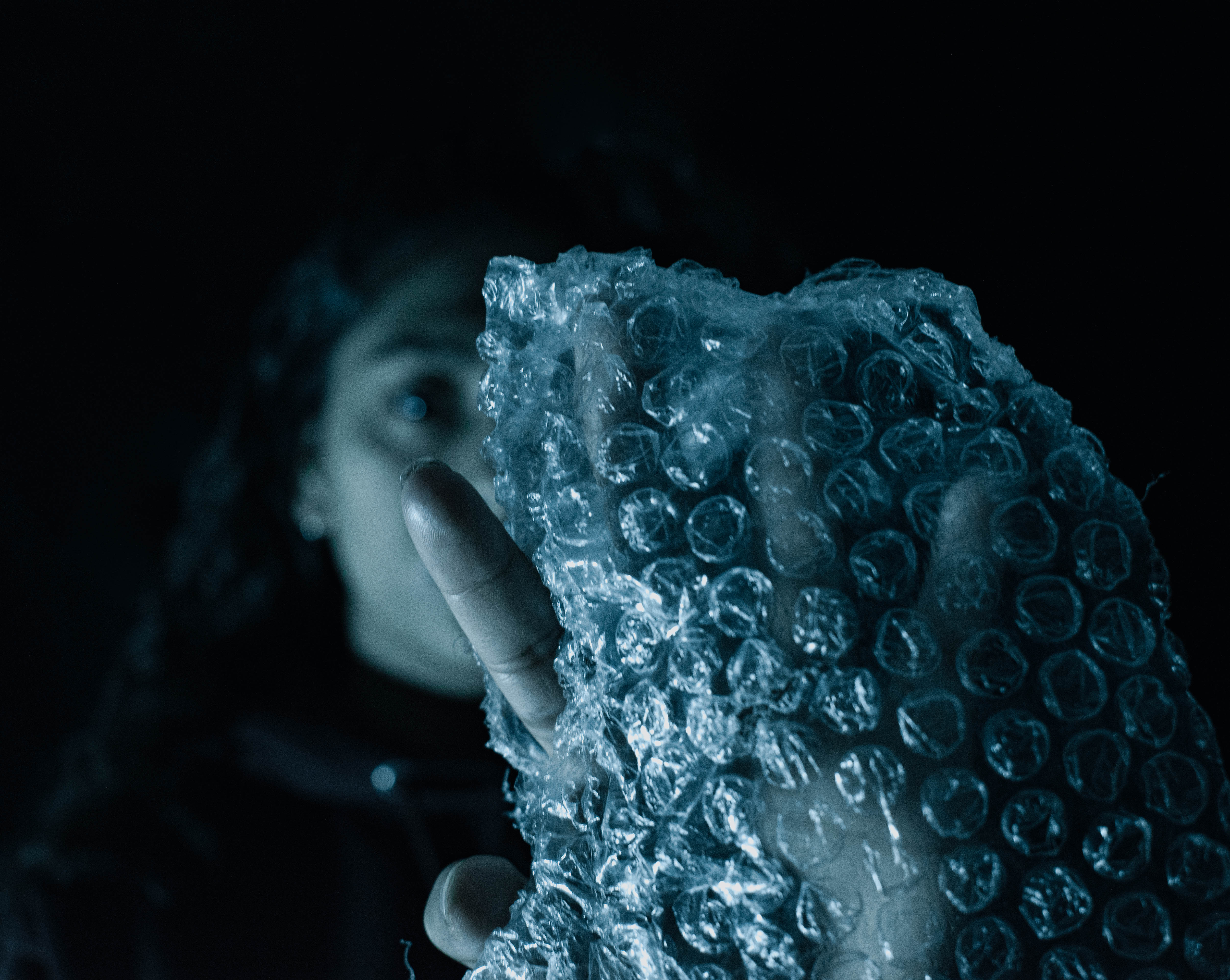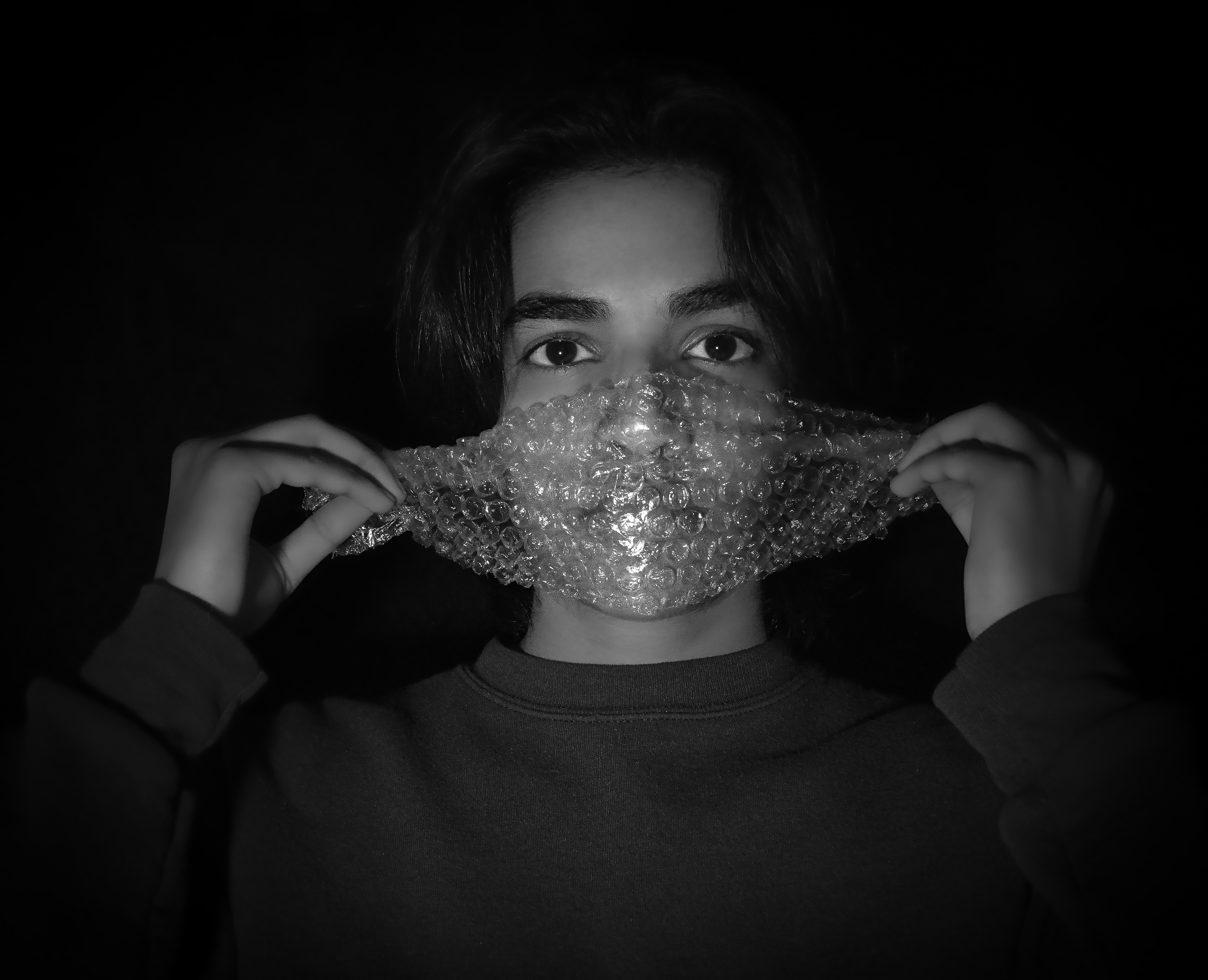 Covid-19 has many people feeling isolated. The subject is holding a mask made of bubble wrap to represent the feeling of being stuck in a bubble. However, the bubble wrap mask also represents protection.