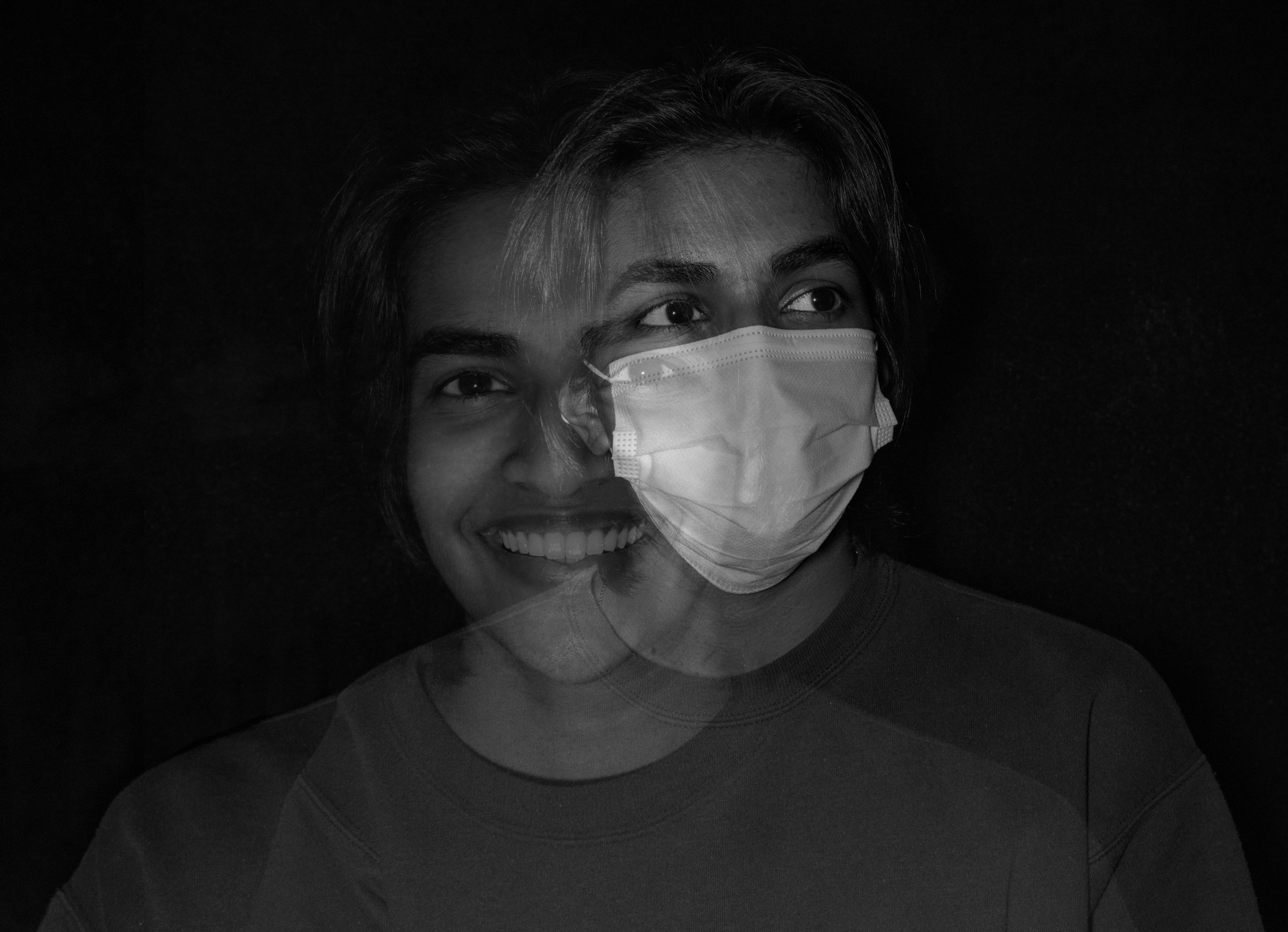 Although someone may be smiling on the outside, on the inside they could be feeling completely different. A mask might cover a smile, but a smile might also be covering sadness. The photo was taken in black & white to emphasize these darker feelings that can be related to deteriorating mental health during the pandemic.