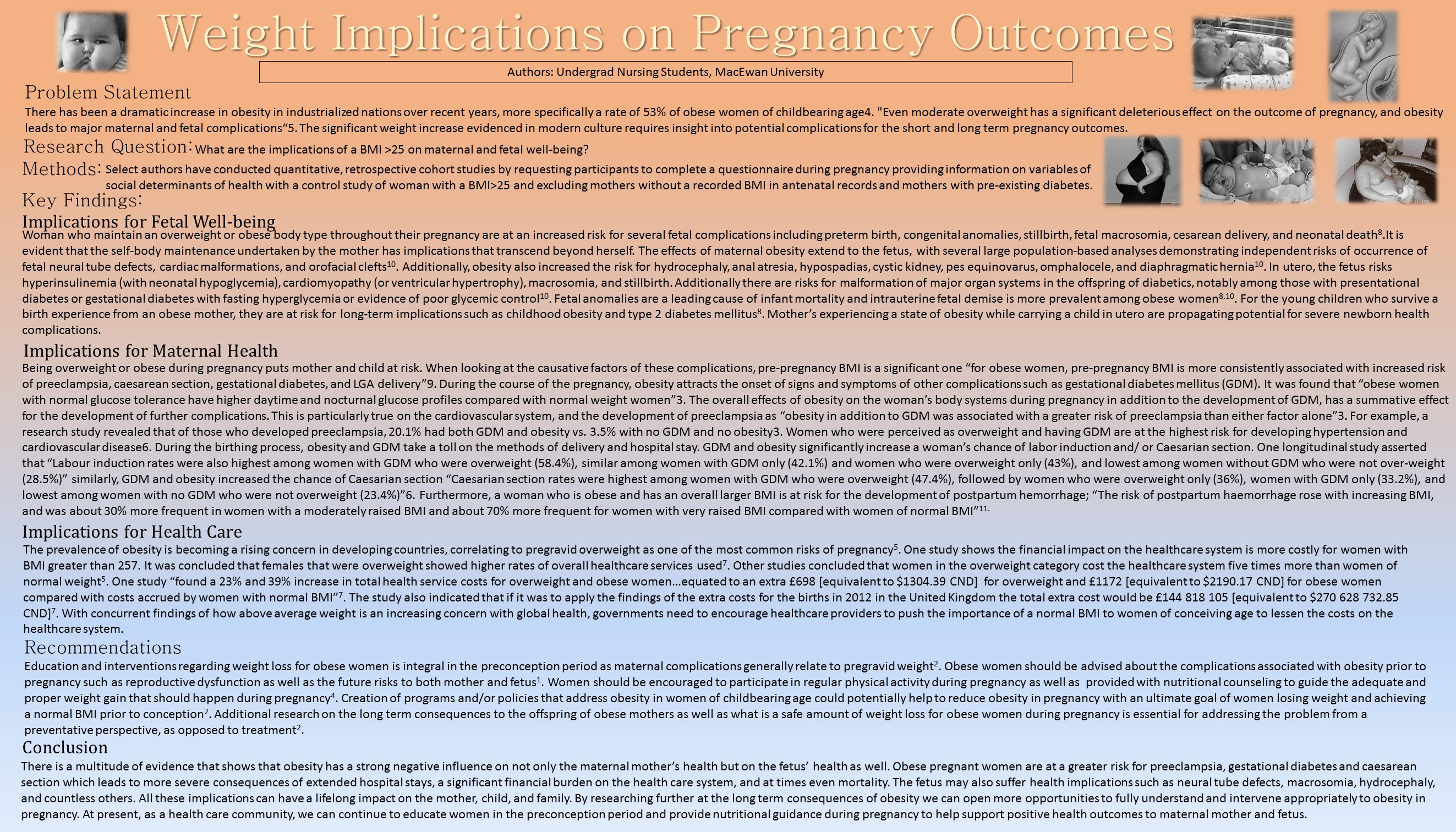 The incidence of rising weight in reproducing women has potential for adverse maternal and fetal outcomes, both short and long term. The purpose of the project was to identify the extent of potential implications resulting from maintaining a body mass index larger than 25 throughout a pregnancy. Select authors have conducted quantitative, retrospective cohort studies by requesting participants to complete a questionnaire during pregnancy providing information on variables of social determinants of health with a control study of woman with a BMI under 25 and excluding mothers without a recorded BMI in antenatal records and mothers with pre-existing diabetes. Research resulted in overarching implications for both maternal and fetal well-being with added potential burden on the health care system. Neonate’s born under influence of a maternal BMI larger than 25 risk complications including preterm birth, congenital anomalies, fetal macrosomia, and death. Mothers are at increased risk for preeclampsia, gestational diabetes, postpartum hemorrhage, caesarian section and require more healthcare services. Continued longitudinal studies may provide greater insight into the life course trajectories of children born under such circumstances, and offer interventions appropriate to aid consequences of weight implications on pregnancy outcomes. Furthermore, additional studies on appropriate and safe interventions throughout the pregnancy may minimize potential risks on maternal and fetal well-being. This discussion is designed to explain the gravity of weight juxtaposed with pregnancy, and provide strategies aimed at optimizing health outcomes.